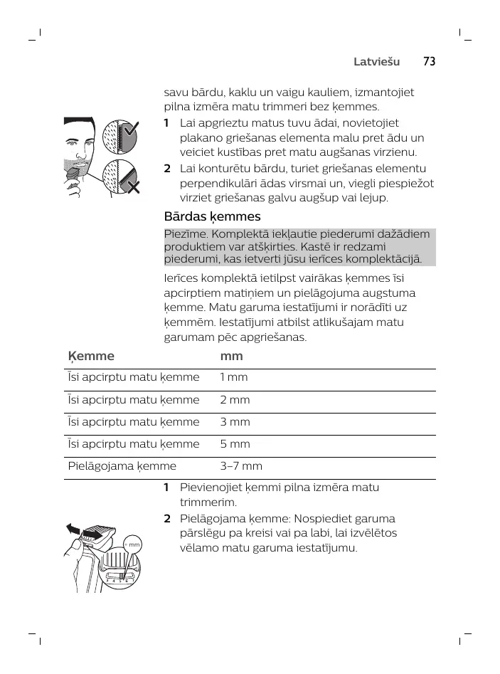 ķemme. Matu garuma iestatījumi ir norādīti uД