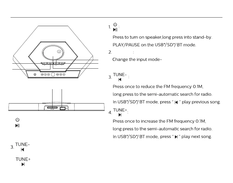 Philips MMS8085B/94 - Top Panel Operation; Power, Volume, and Input Selection; Tuning and Media Navigation Controls; SD and USB Media Playback