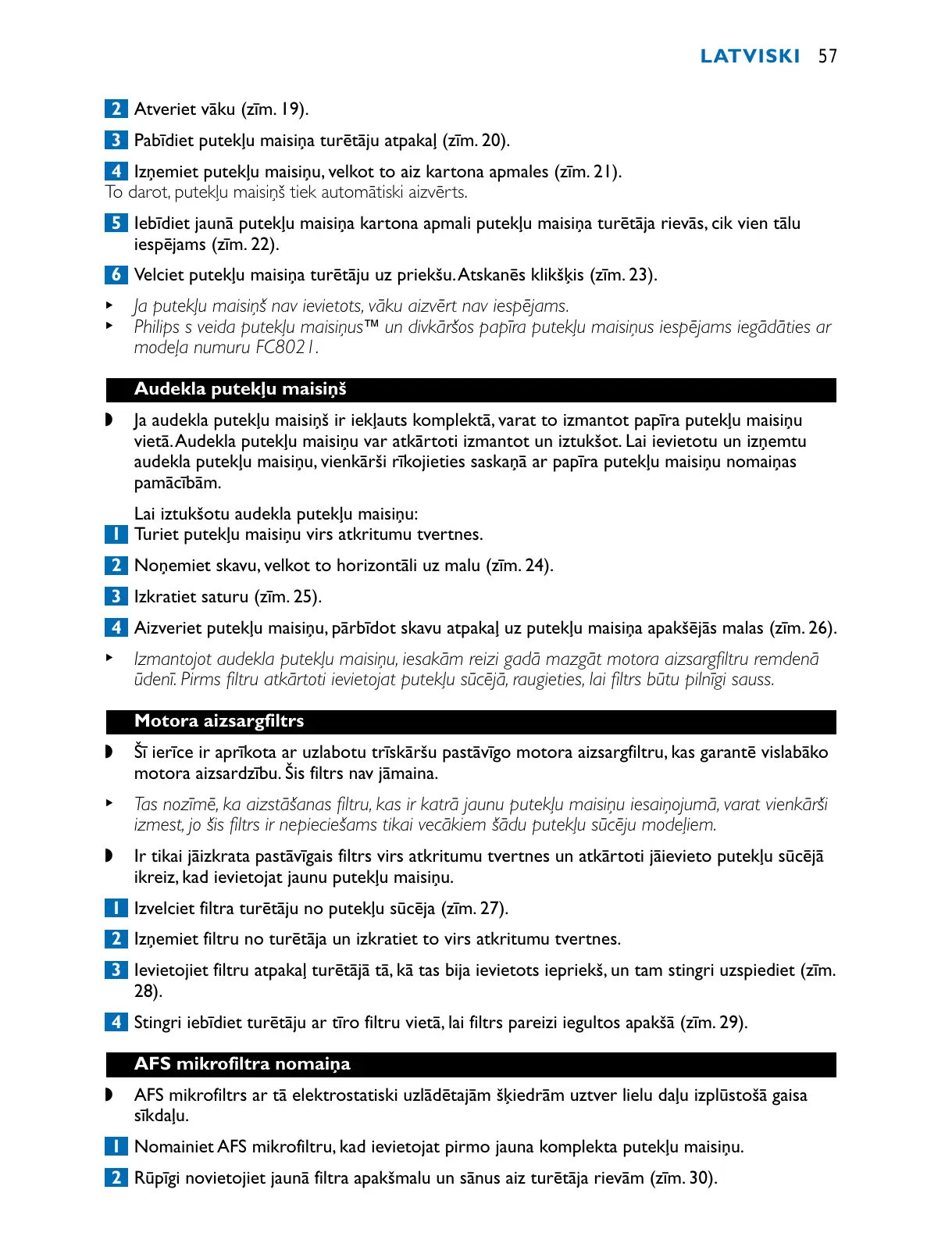 1 Nomainiet AFS mikrofiltru, kad ievietojat pirmo jauna komplekta putekļu maisiņu.