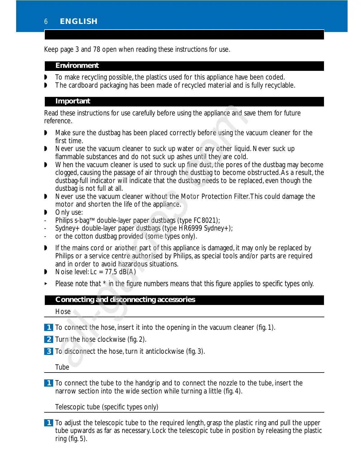 1 To connect the hose,insert it into the opening in the vacuum cleaner (fig.1).