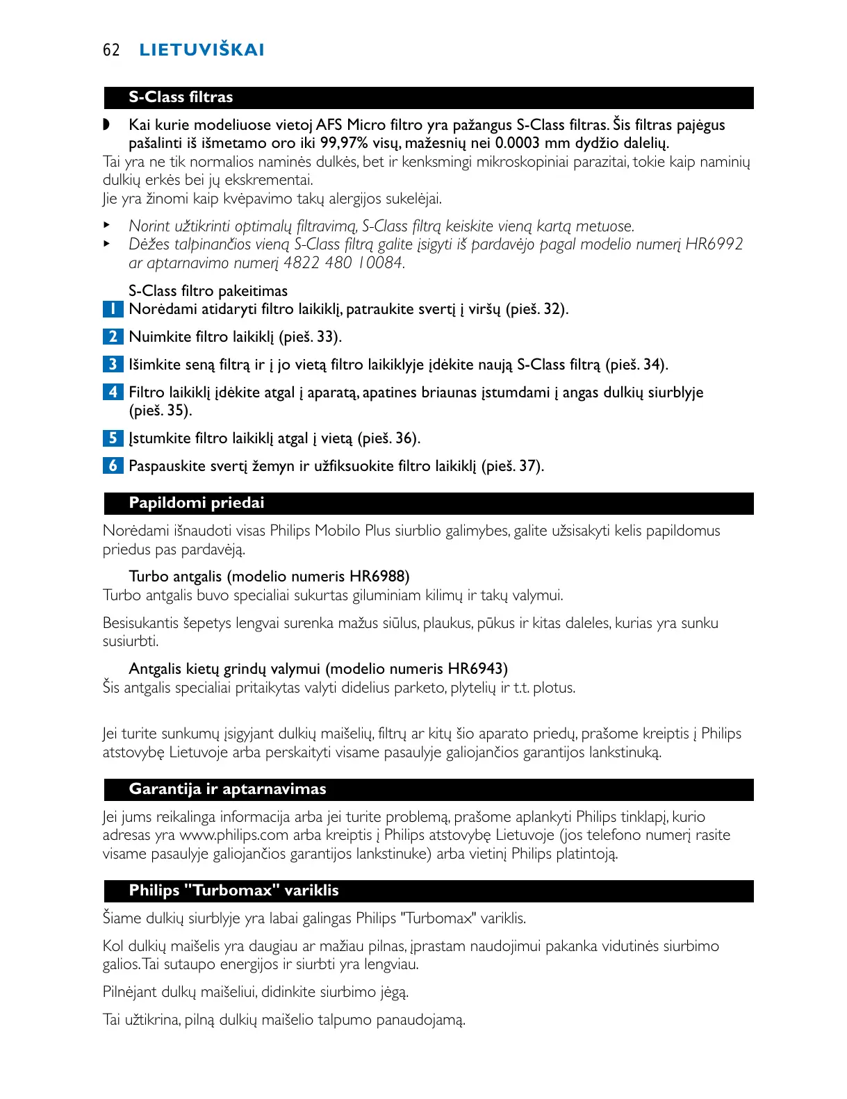 Jei turite sunkumų įsigyjant dulkių maišelių, filtrų ar kitų šio aparato priedų, prašome kreiptis į Philips