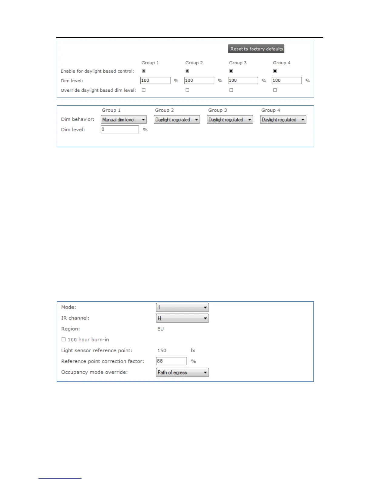 ActiLume DALI gen2, 4 modes are shown, each of which has its own feature tab on