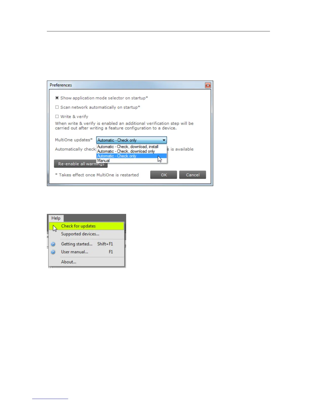 If the preference is set to Manual then the user can check for an update on MultiOne