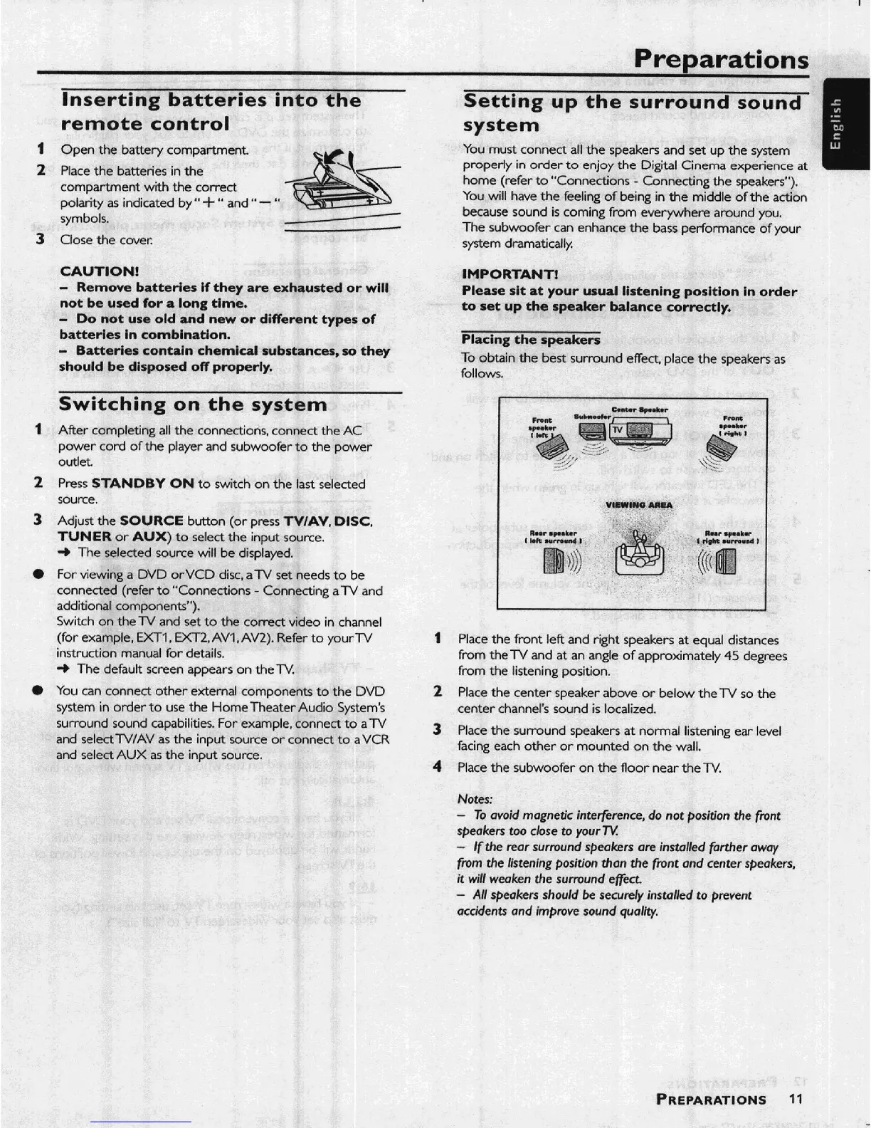 Philips MX-3600D - Preparations; Inserting batteries into the remote control; Switching on the system; Setting up the surround sound system