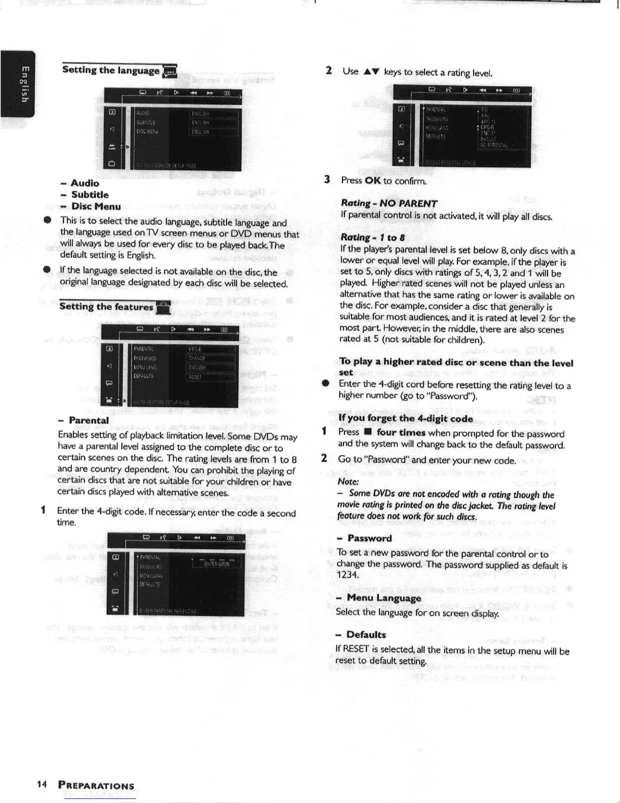 Philips MX-3600D - Setting the Language; Setting the Features; To Play a Higher Rated Disc or Scene than the Level Set; If Your Forget the 4-Digit Code