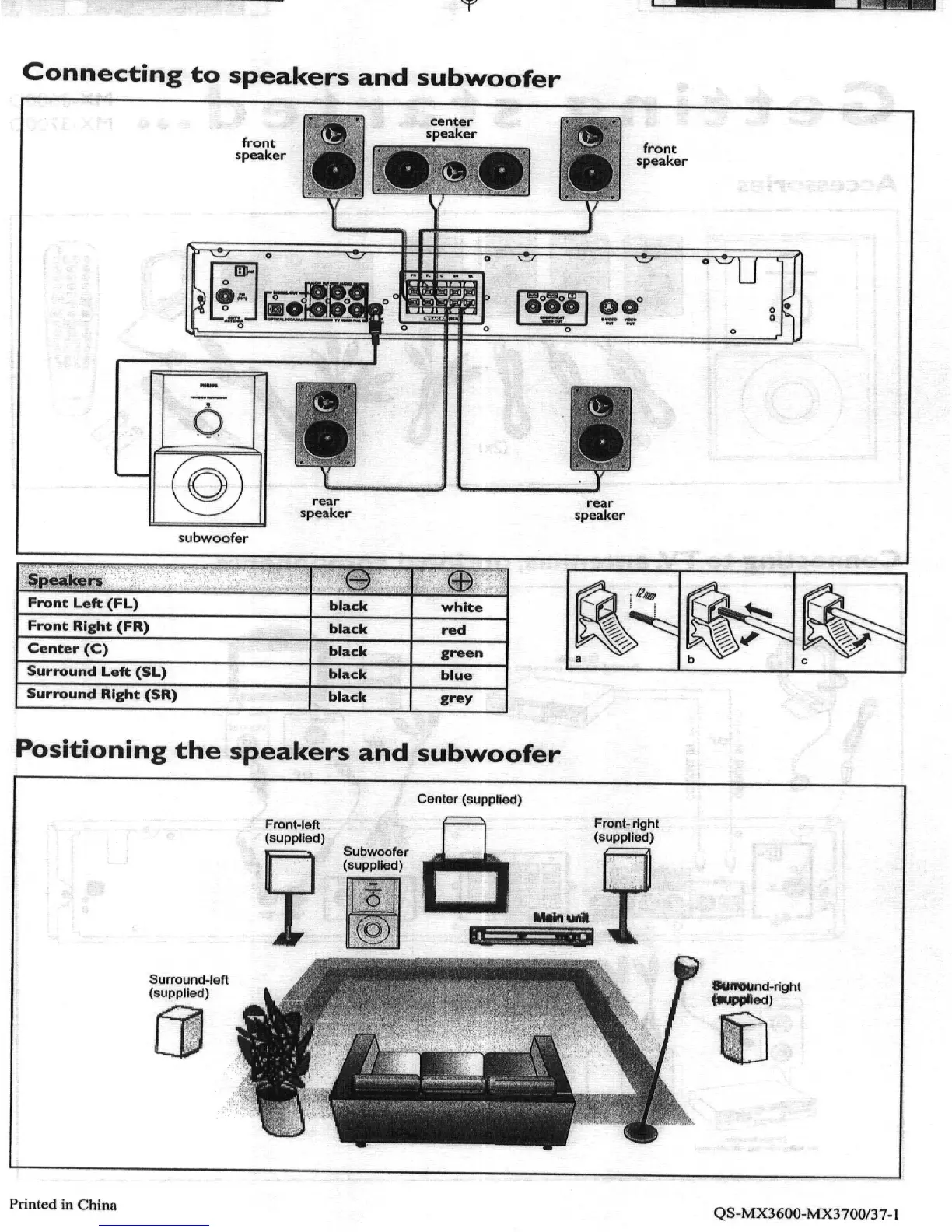 Philips MX-3600D - Connecting to speakers and subwoofer; Positioning the speakers and subwoofer