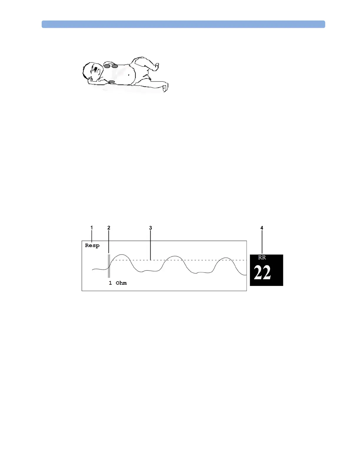 The Resp measurement is displayed on the monitor as a continuous wave and a numeric respiration