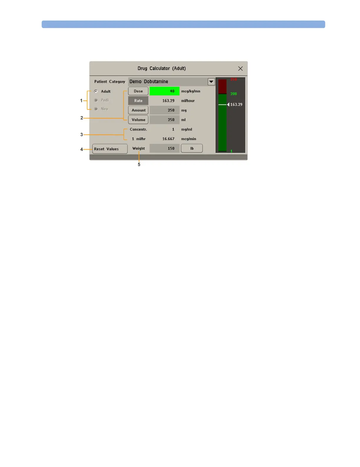 4 When a specific drug is selected, the initial values for Dose, Amount and Volume are the