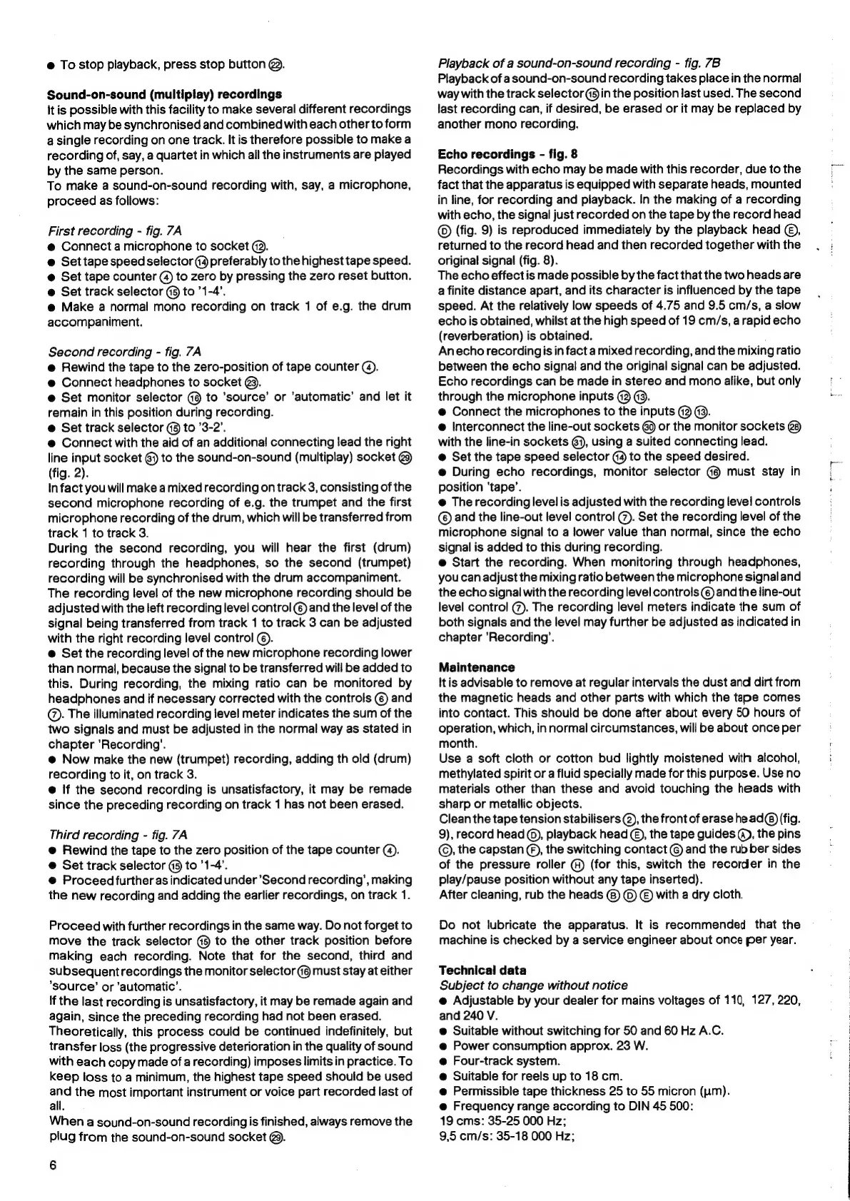 Philips N 7150 - Specialized Recording Modes; Sound-on-Sound (Multiplay) Recordings; Echo Recordings; Maintenance and Specifications