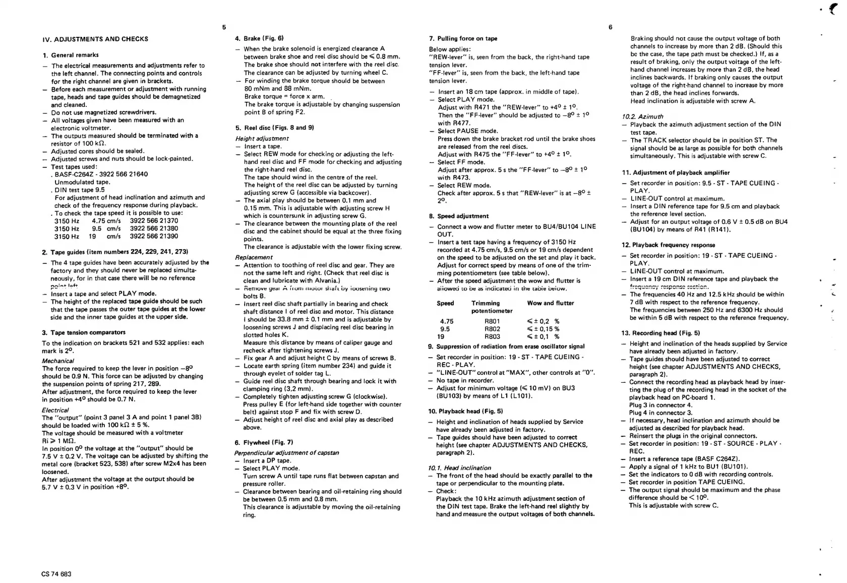 Philips N 7300 - Adjustments and Checks; General Adjustment Guidelines; Mechanical Adjustments; Speed and Erase Head Calibration