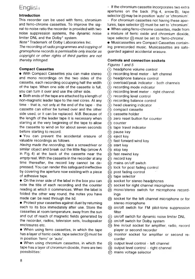 Philips N2521 - Introduction and Cassette Information; Recorder Overview and Cassette Handling; Controls and Connection Sockets; Identification of Controls and Sockets