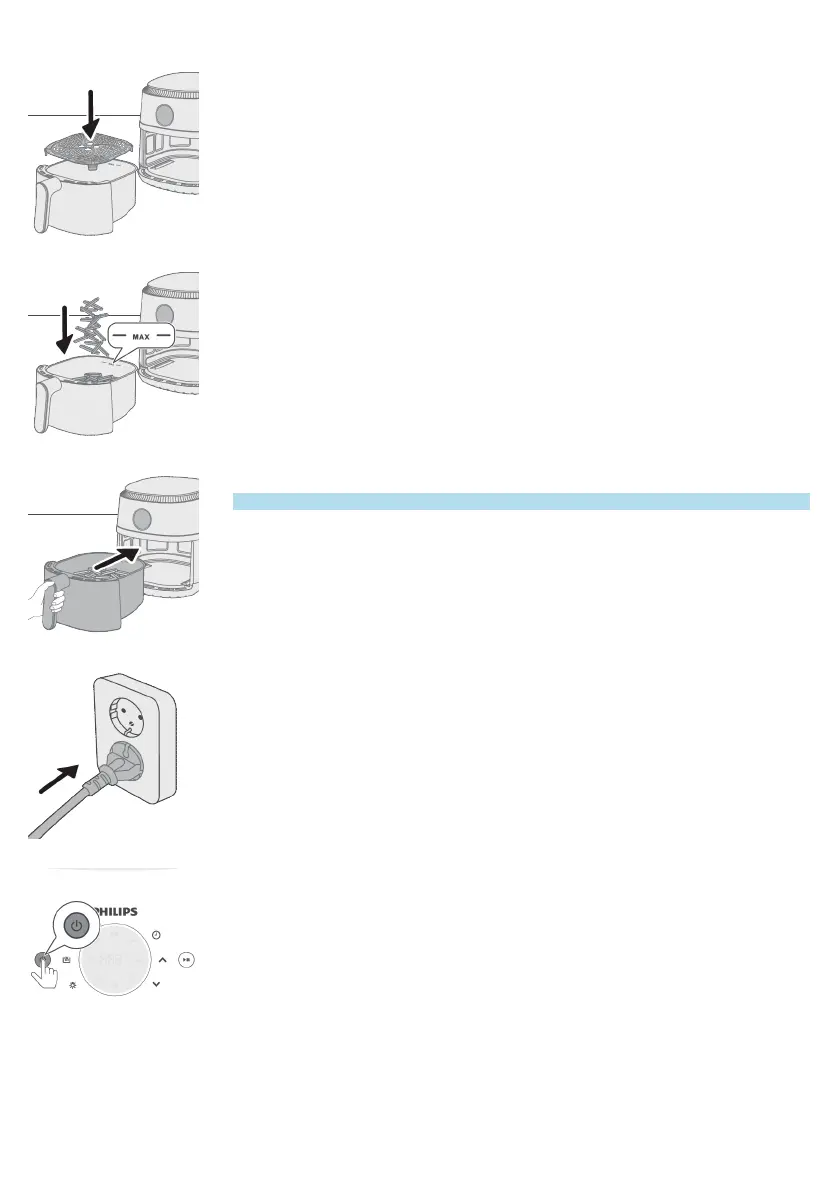 ‘조리 표’에 제시된 시간을 초과하거나 ‘MAX’ 표시선을 초과하여 팬을 채우면