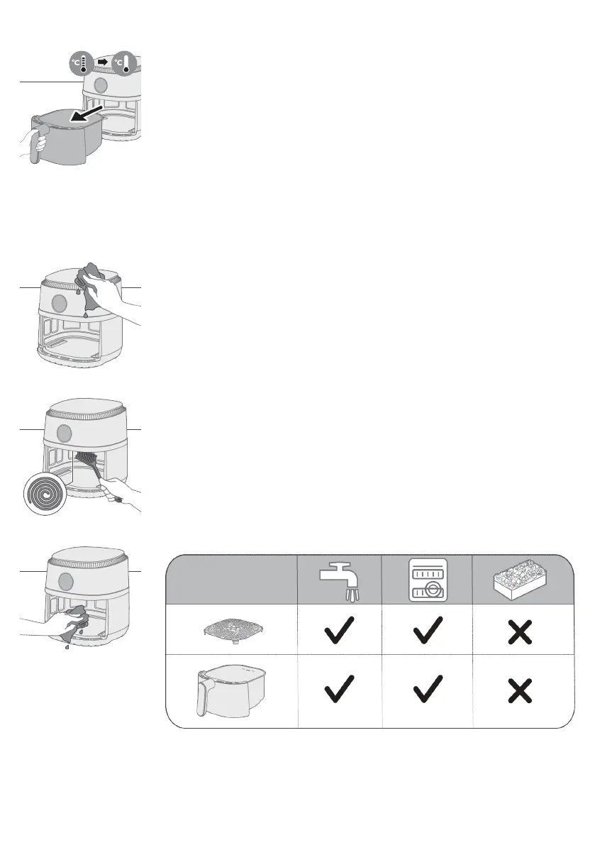 若炸籃或底網上黏著食物殘渣,可浸泡在熱水和洗碗精裡 10–15 分鐘。