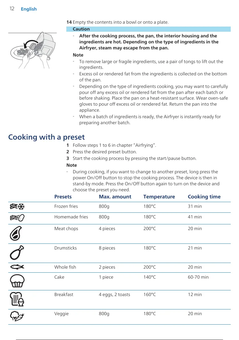 Presets Max. amount Temperature Cooking time
