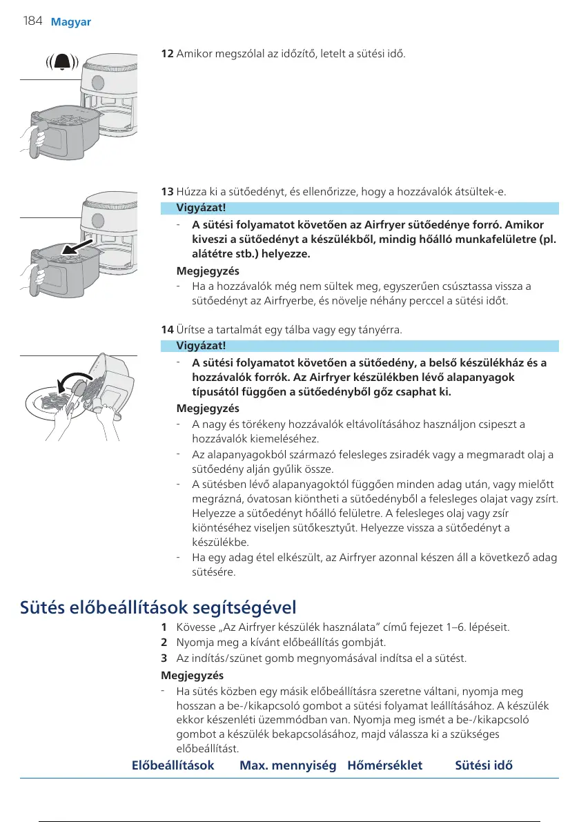 A sütési folyamatot követően az Airfryer sütőedénye forró. Amikor