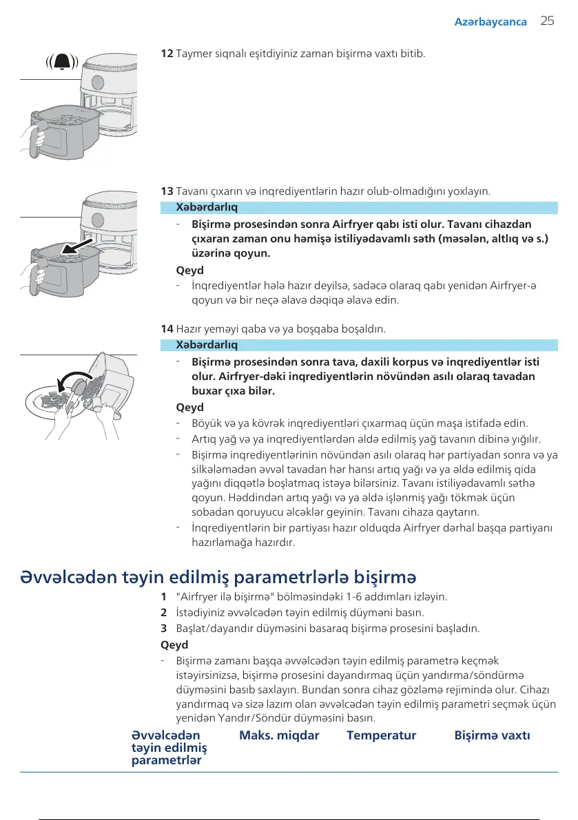 Bişirmə prosesindən sonra Airfryer qabı isti olur. Tavanı cihazdan