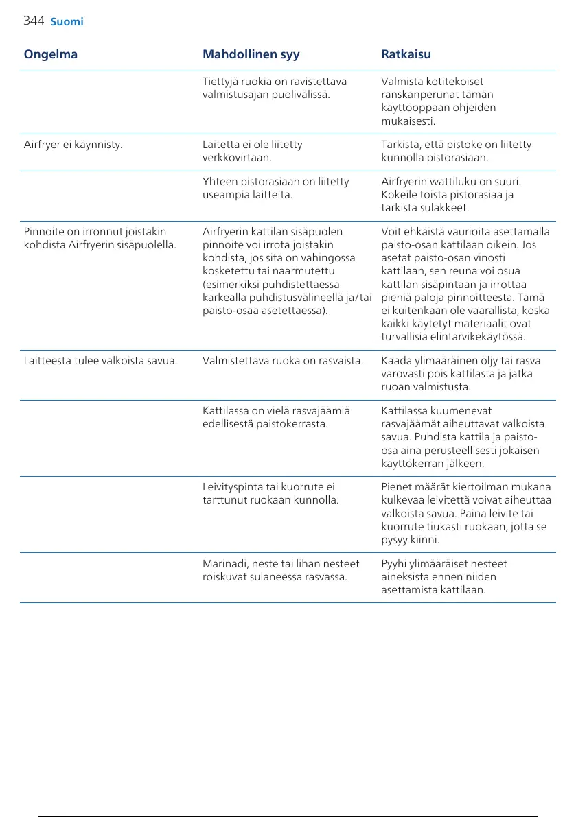 Laitteesta tulee valkoista savua. Valmistettava ruoka on rasvaista. Kaada ylimääräinen öljy tai rasva