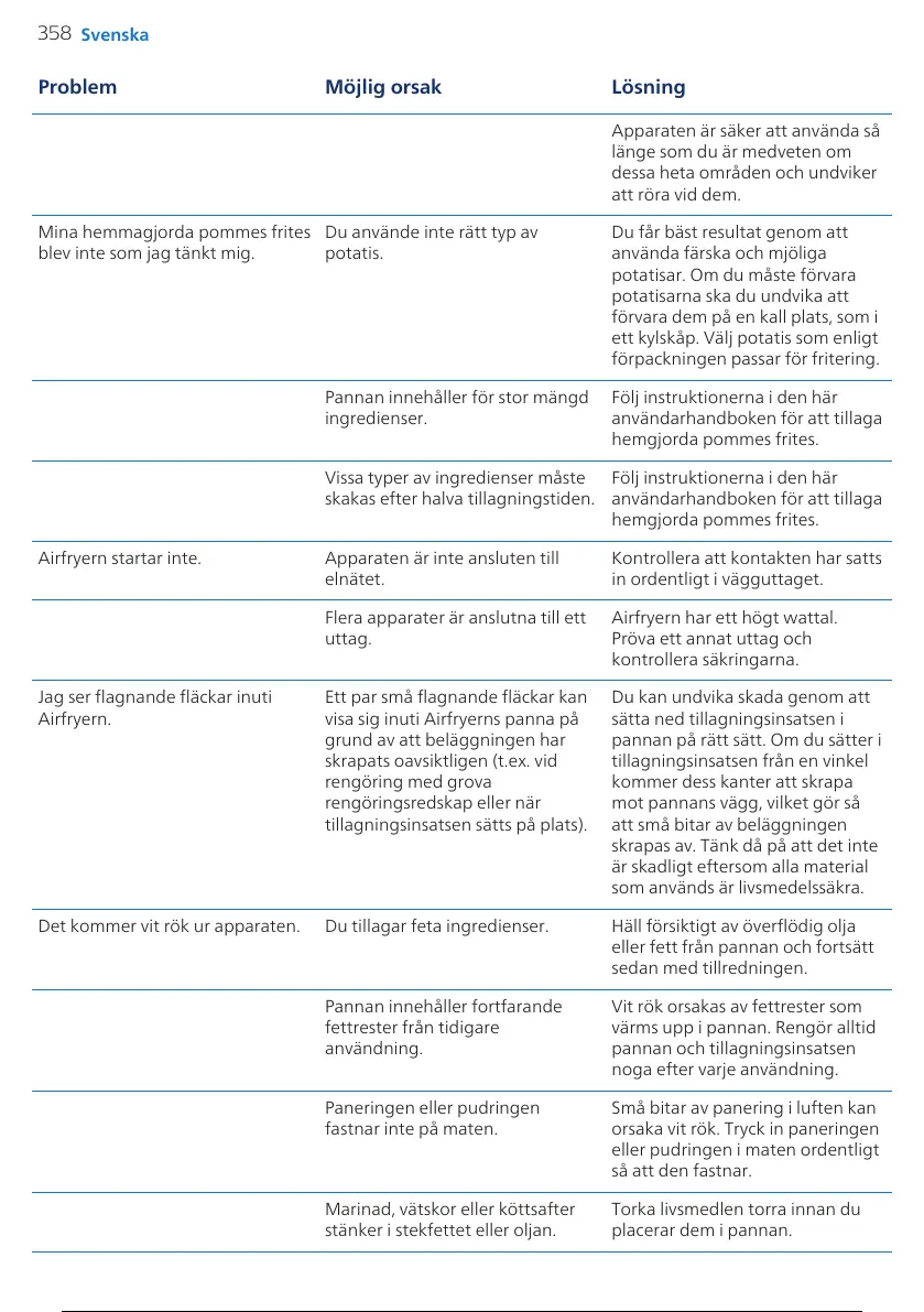 Det kommer vit rök ur apparaten. Du tillagar feta ingredienser. Häll försiktigt av överflödig olja