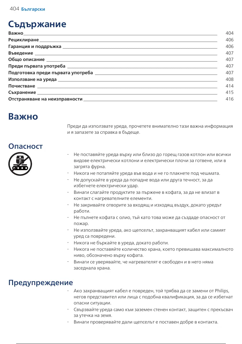 Ако захранващият кабел е повреден, той трябва да се замени от Philips,