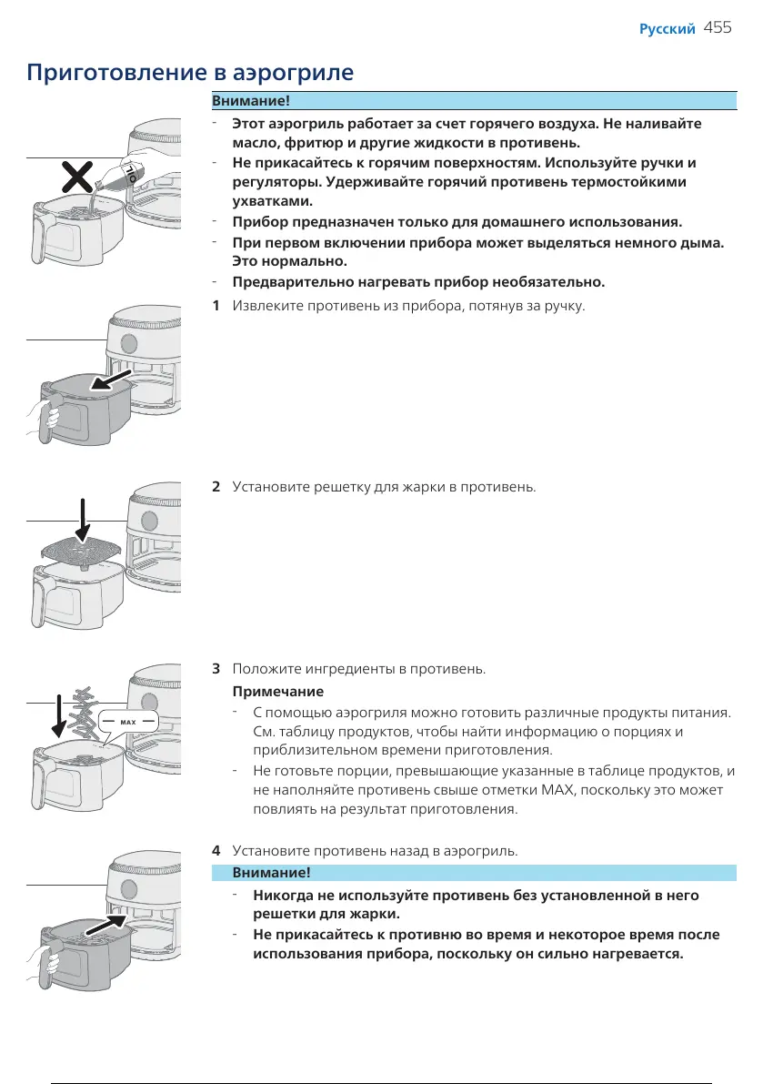 не наполняйте противень свыше отметки MAX, поскольку это может