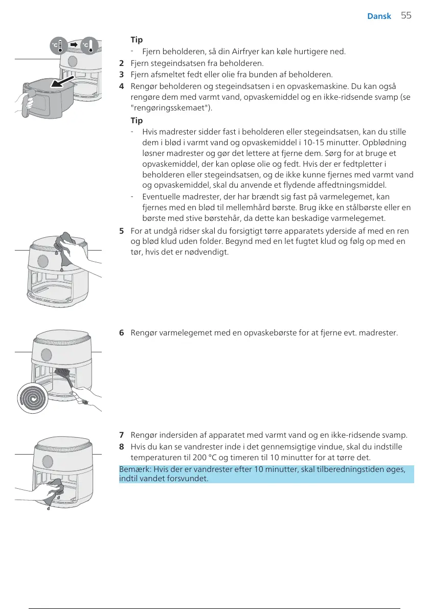 4 Rengør beholderen og stegeindsatsen i en opvaskemaskine. Du kan også