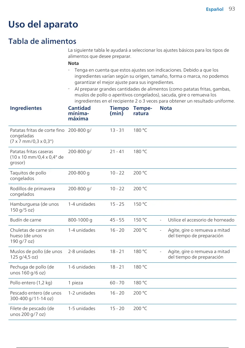 muslos de pollo o aperitivos congelados), sacuda, gire o remueva los
