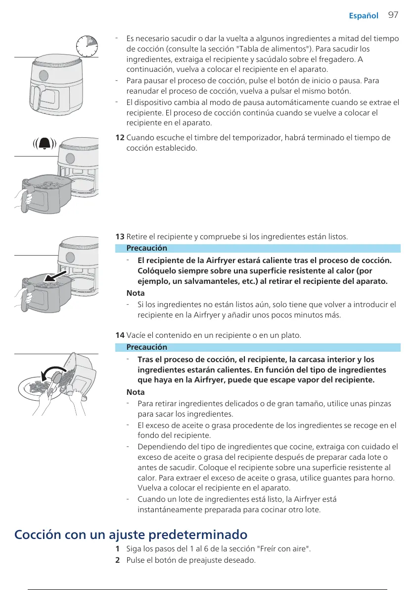 El recipiente de la Airfryer estará caliente tras el proceso de cocción.