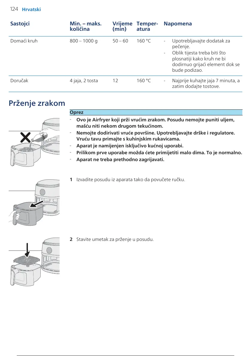 Ovo je Airfryer koji prži vrućim zrakom. Posudu nemojte puniti uljem,