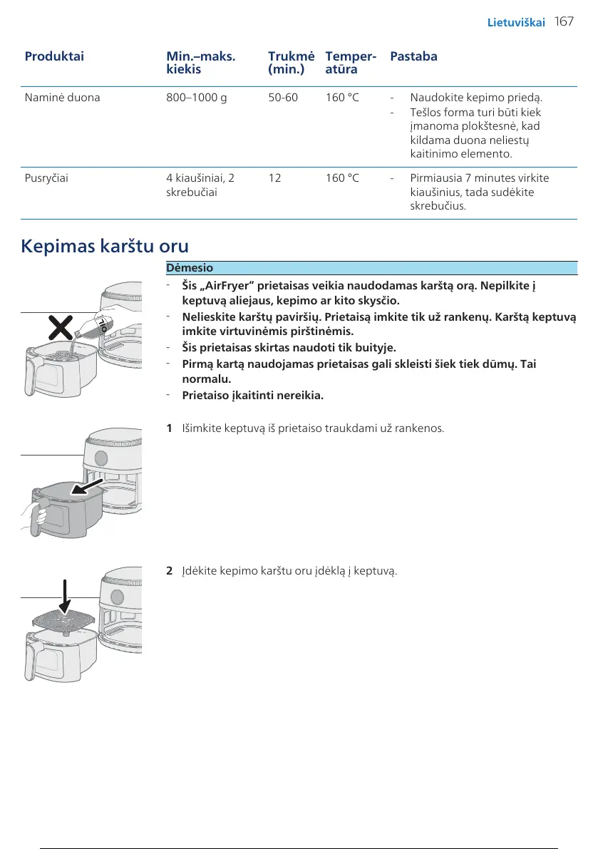 Šis „AirFryer“ prietaisas veikia naudodamas karštą orą. Nepilkite į