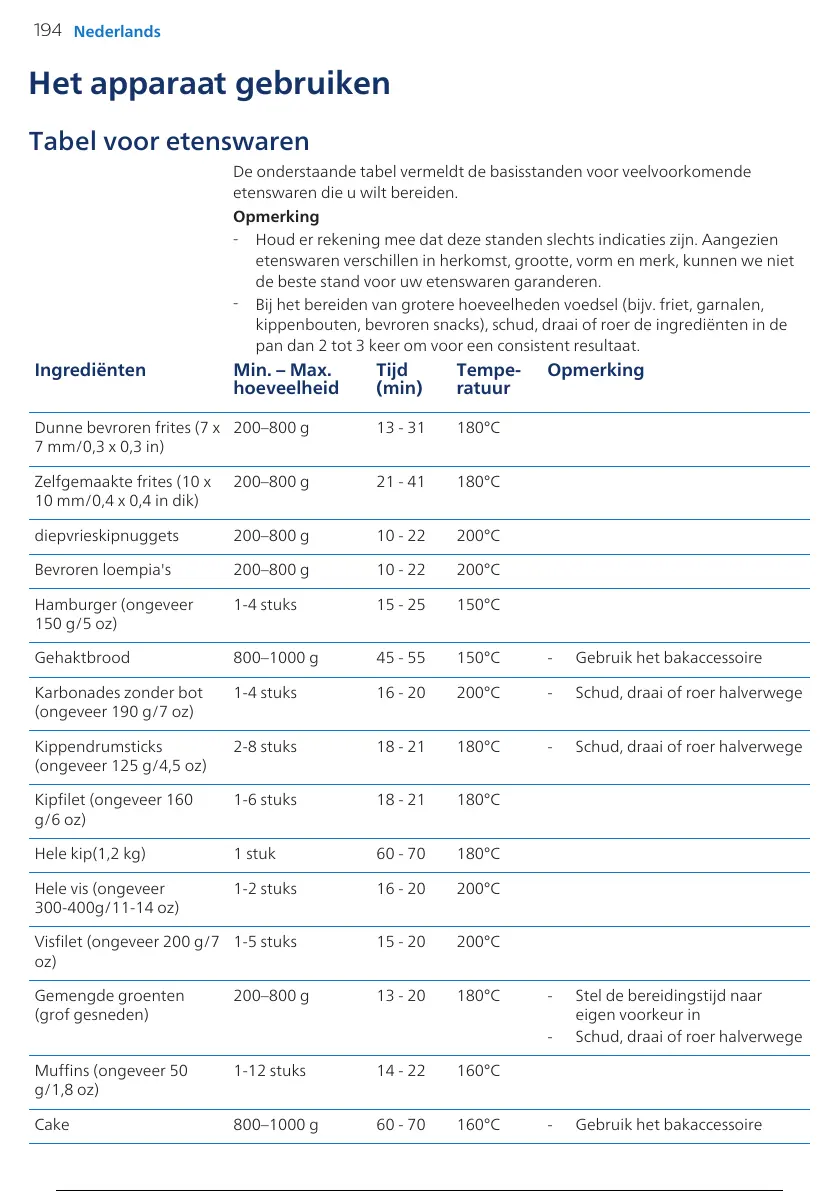 200–800g 13 - 20 180°C - Stel de bereidingstijd naar