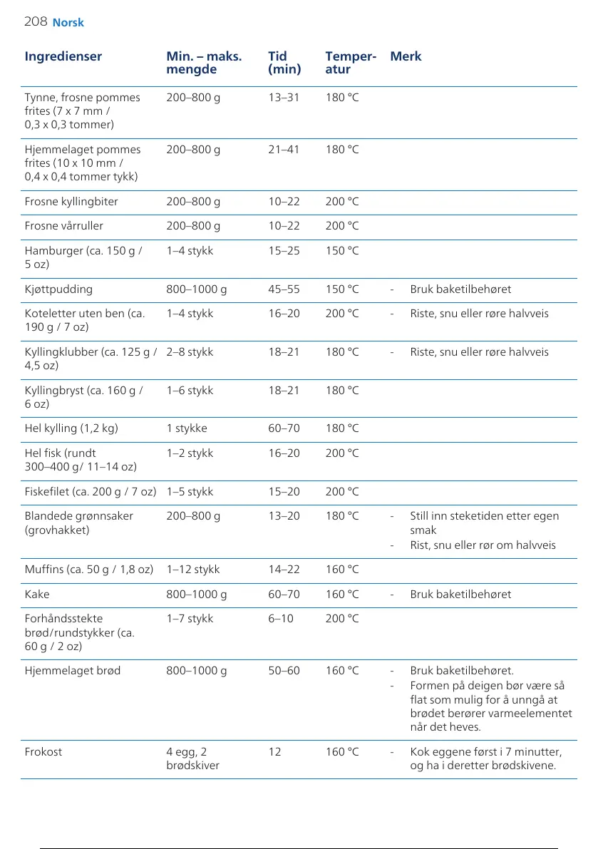 1–4 stykk 16–20 200°C - Riste, snu eller røre halvveis
