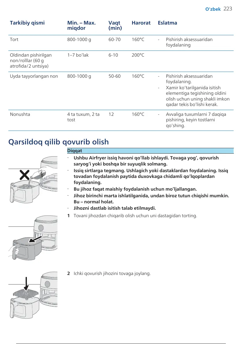 Ushbu Airfryer issiq havoni qo‘llab ishlaydi. Tovaga yog‘, qovurish