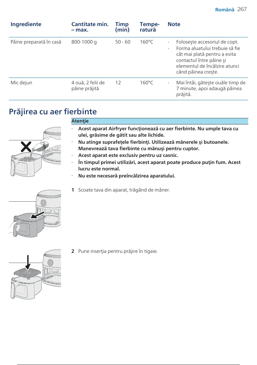 Acest aparat Airfryer funcţionează cu aer fierbinte. Nu umple tava cu