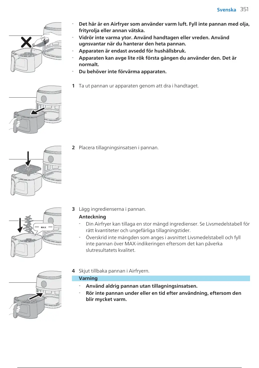 Det här är en Airfryer som använder varm luft. Fyll inte pannan med olja,