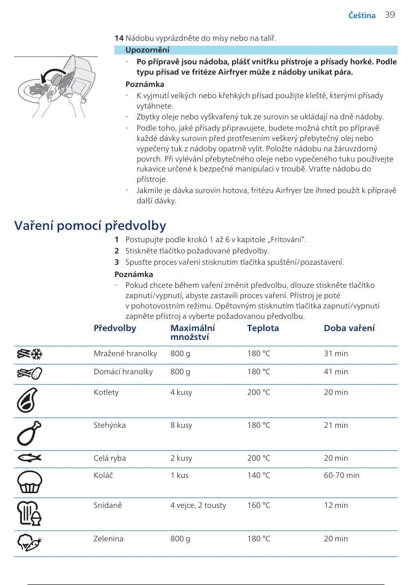 Jakmile je dávka surovin hotova, fritézu Airfryer lze ihned použít kpřípravě