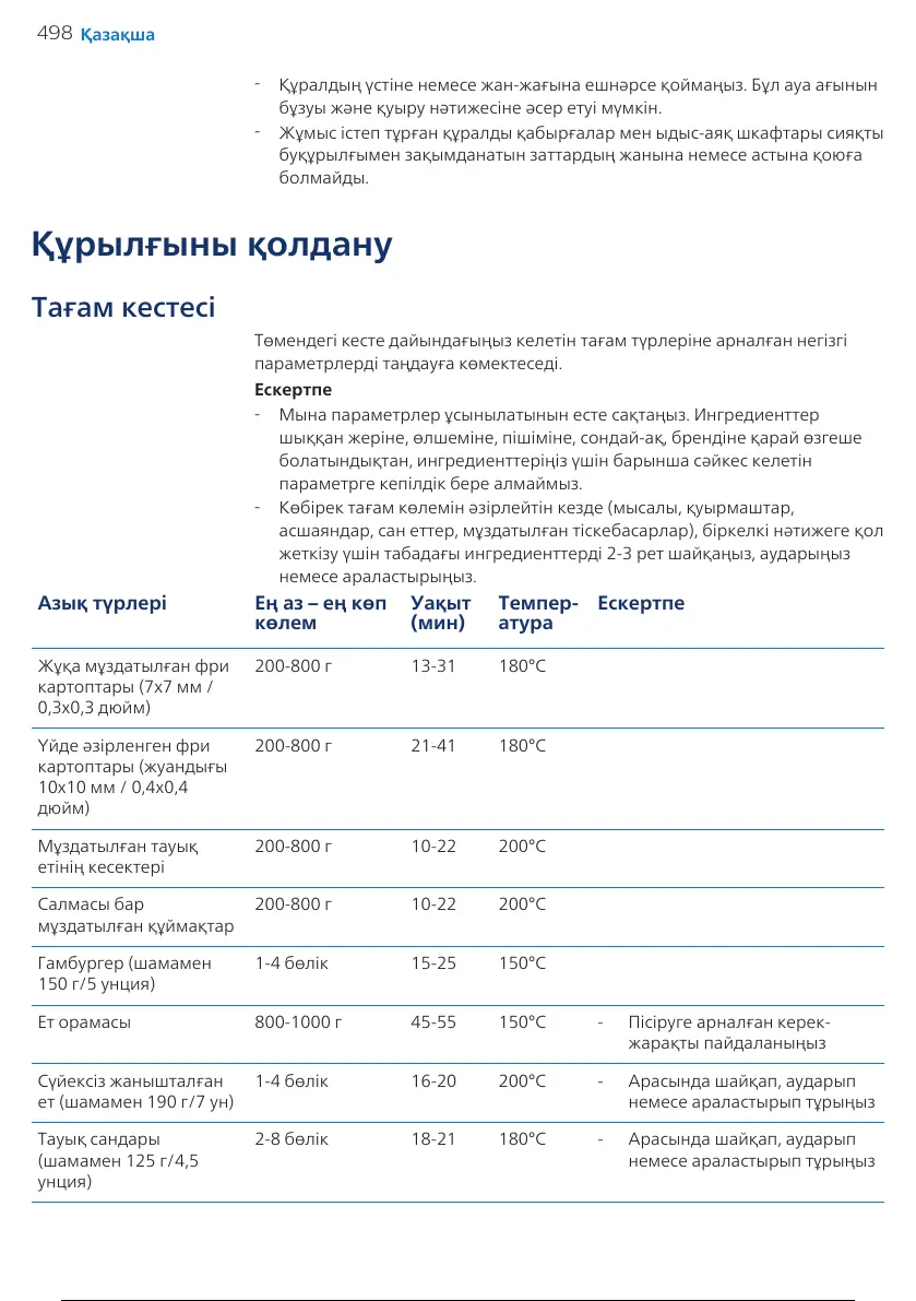 Төмендегі кесте дайындағыңыз келетін тағам түрлеріне арналған негізгі