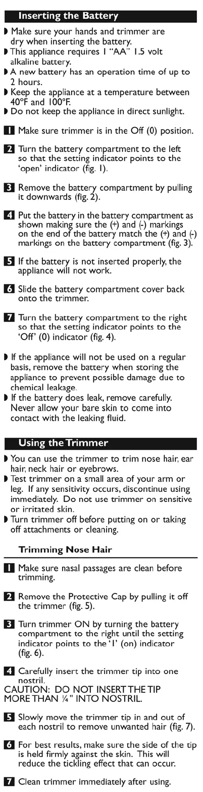 Philips NORELCO NT9110 - Inserting the Battery; Battery Installation Procedure; Using the Trimmer; Trimming Nose Hair