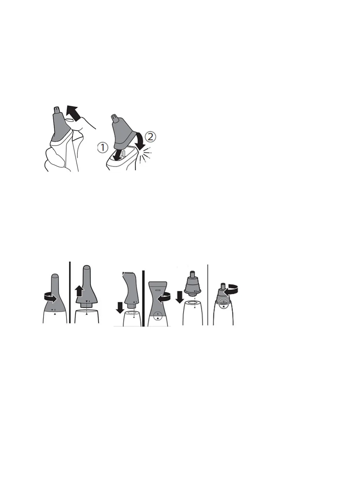 2. To attach the nose trimmer or trimming head, place it on the handle aligning both triangle “^”