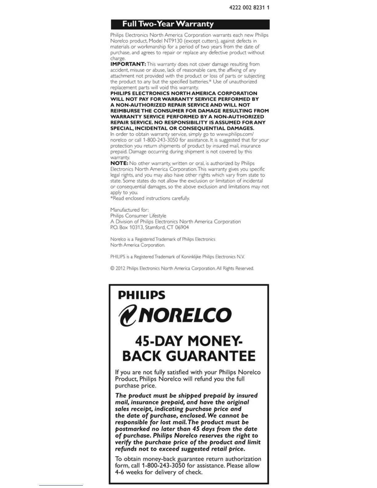 Philips NT9130/40 - Full Two-Year Warranty; Warranty Coverage and Exclusions; Obtaining Warranty Service; 45-Day Money-Back Guarantee