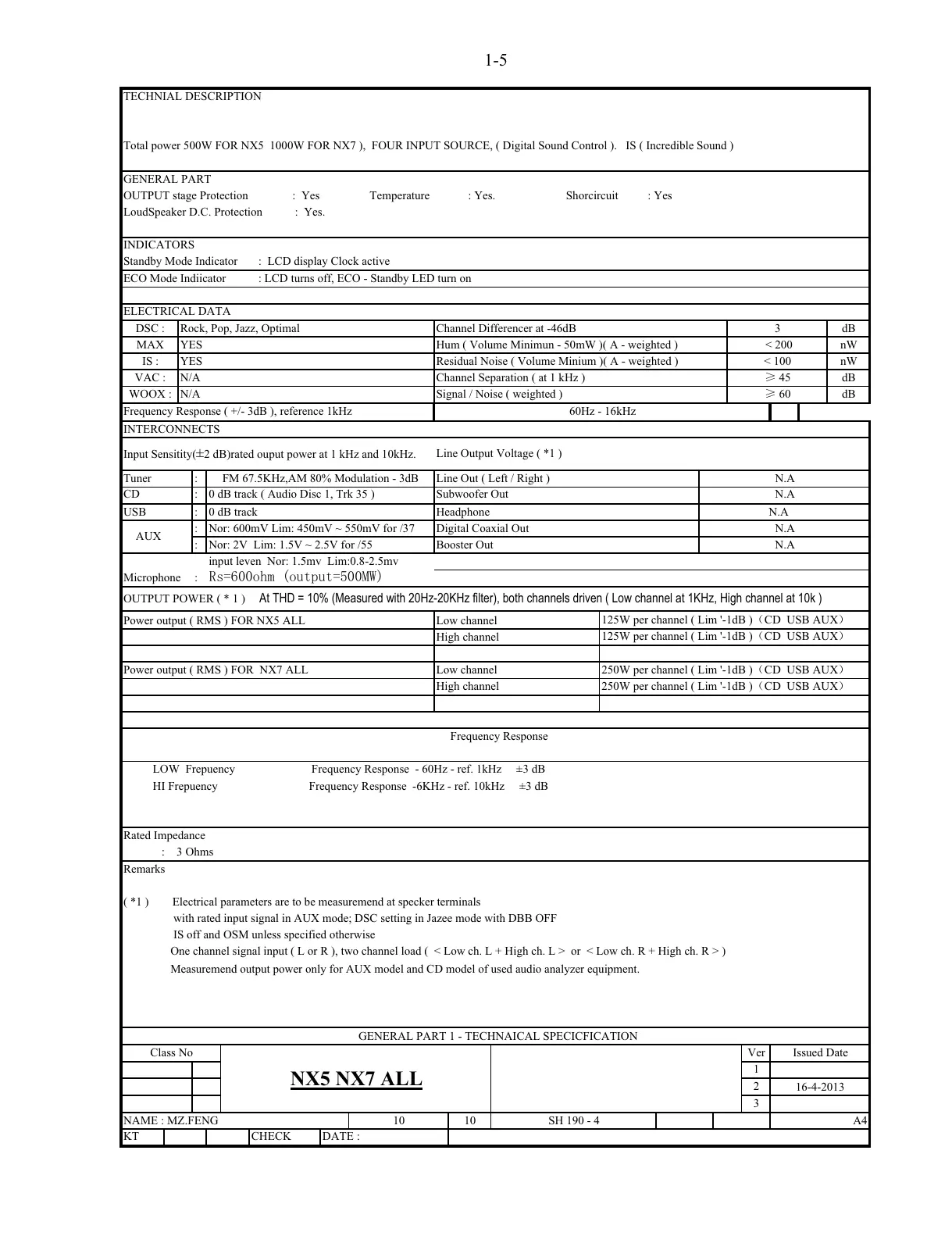 Power output ( RMS ) FOR NX5 ALL Low channel