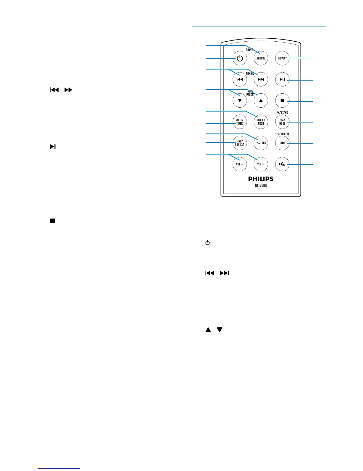 • Select a source: CD, USB, FM, Phono/