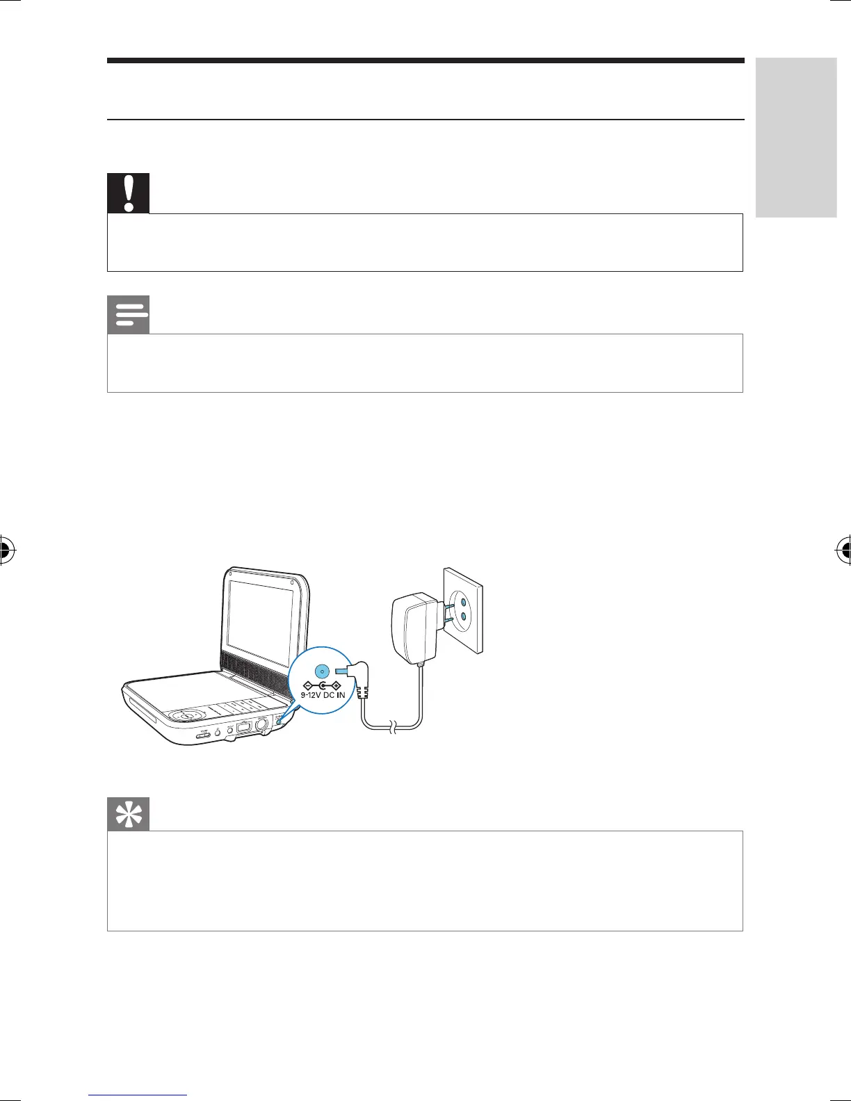 2 Connect the supplied AC adaptor to the player and to the AC outlet.