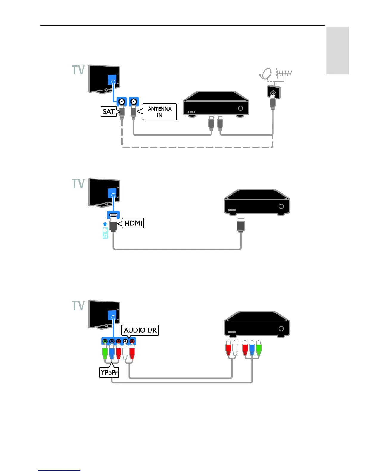 Connect the satellite or digital TV receiver to the TV with an HDMI cable.