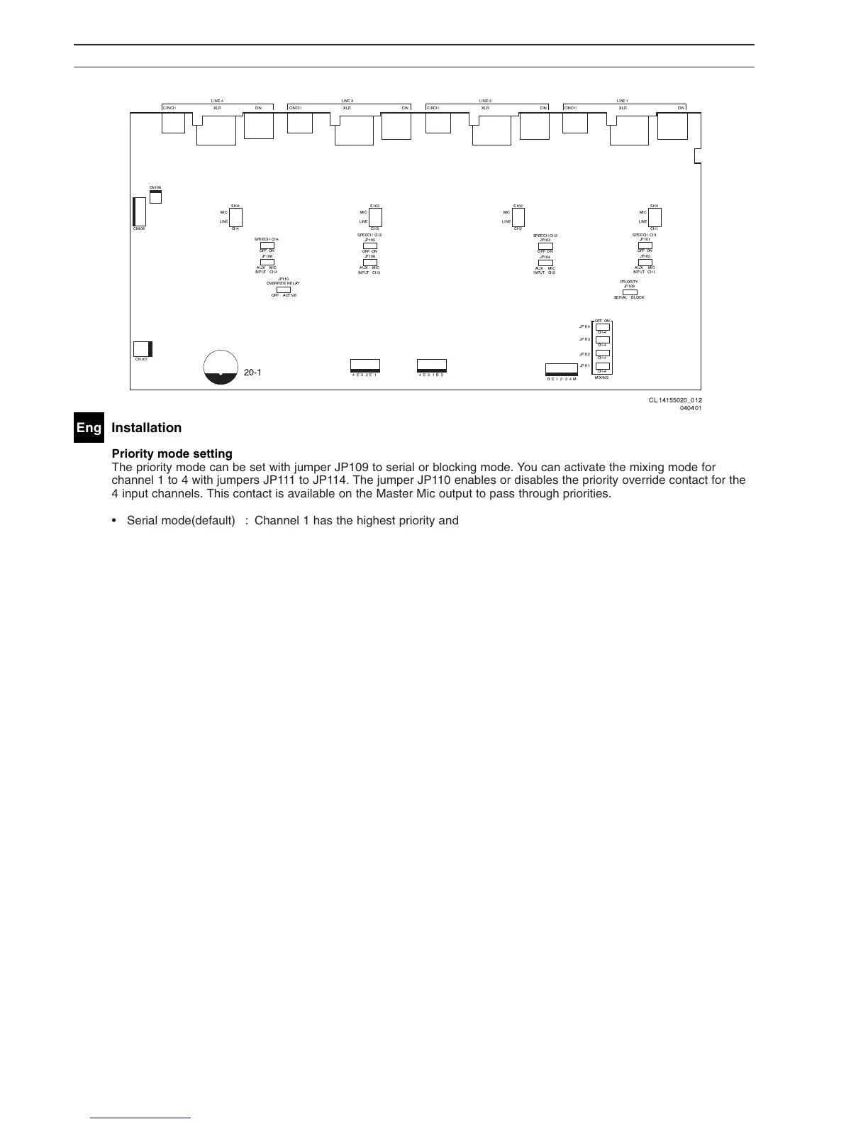 channel 1 to 4 with jumpers JP111 to JP114. The jumper JP110 enables or disables the priority override contact for the