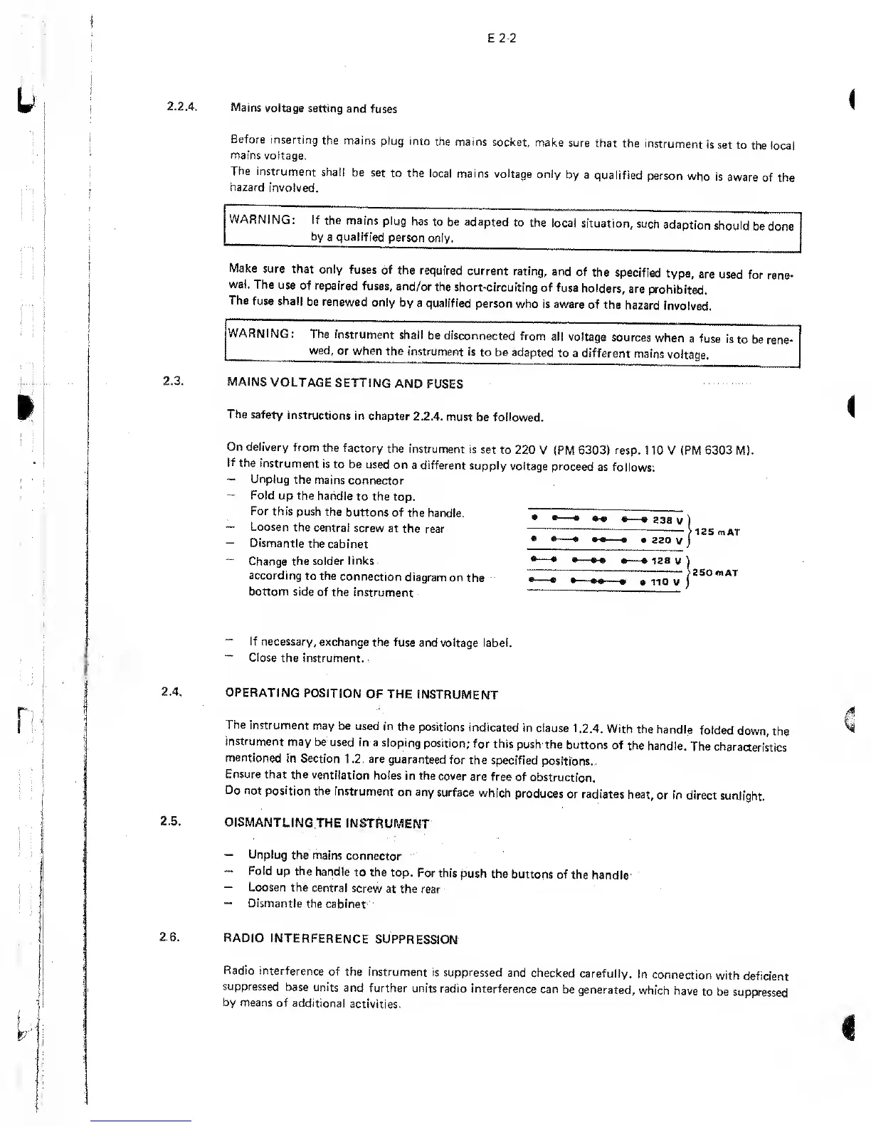 Philips PM 6303 - 2.2.4. Mains voltage setting and fuses; 2.3. MAINS VOLTAGE SETTING AND FUSES