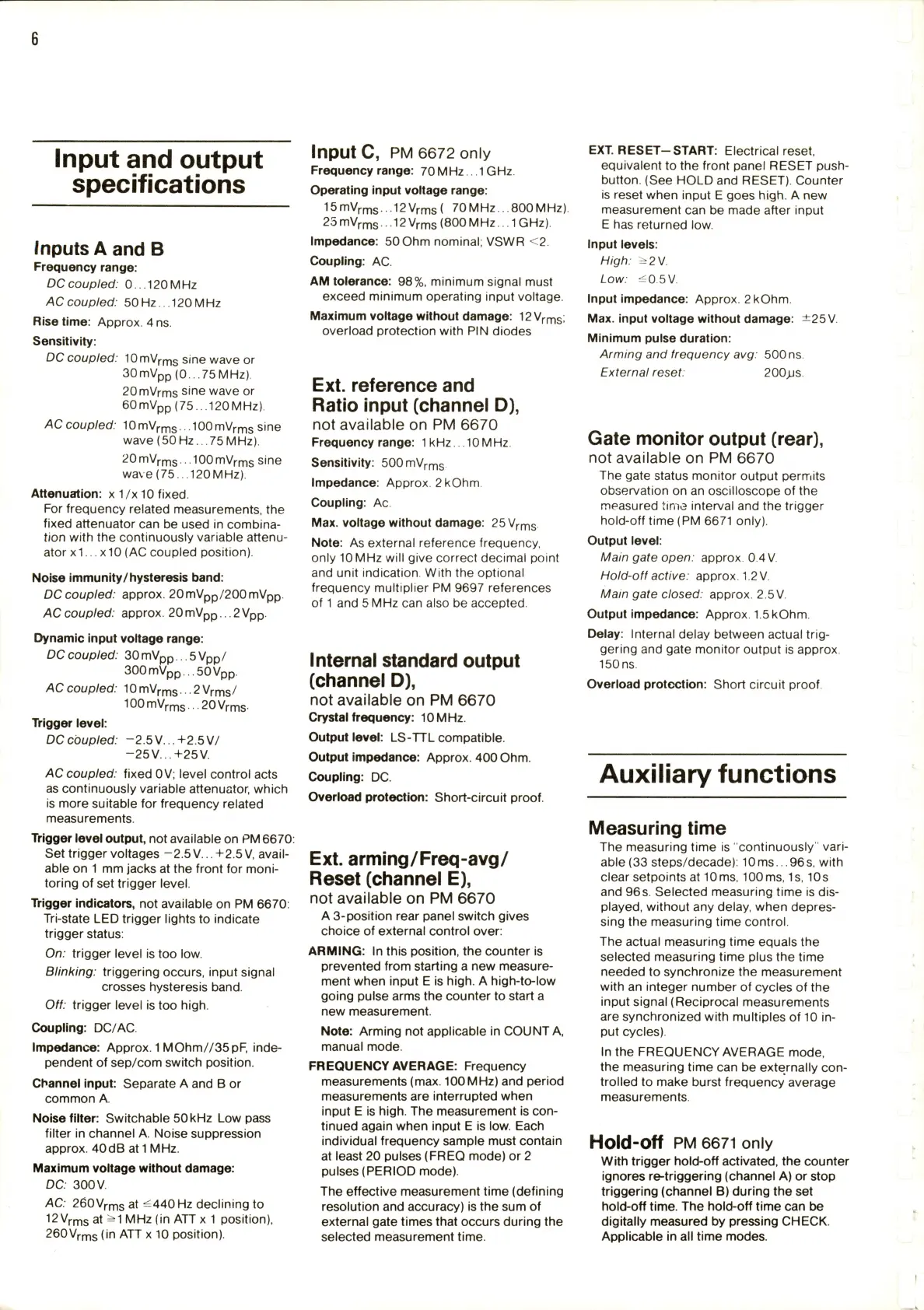 Philips PM 6671 - Input and Output Specifications; Input A and B Specifications; Input C Specifications (PM 6672)