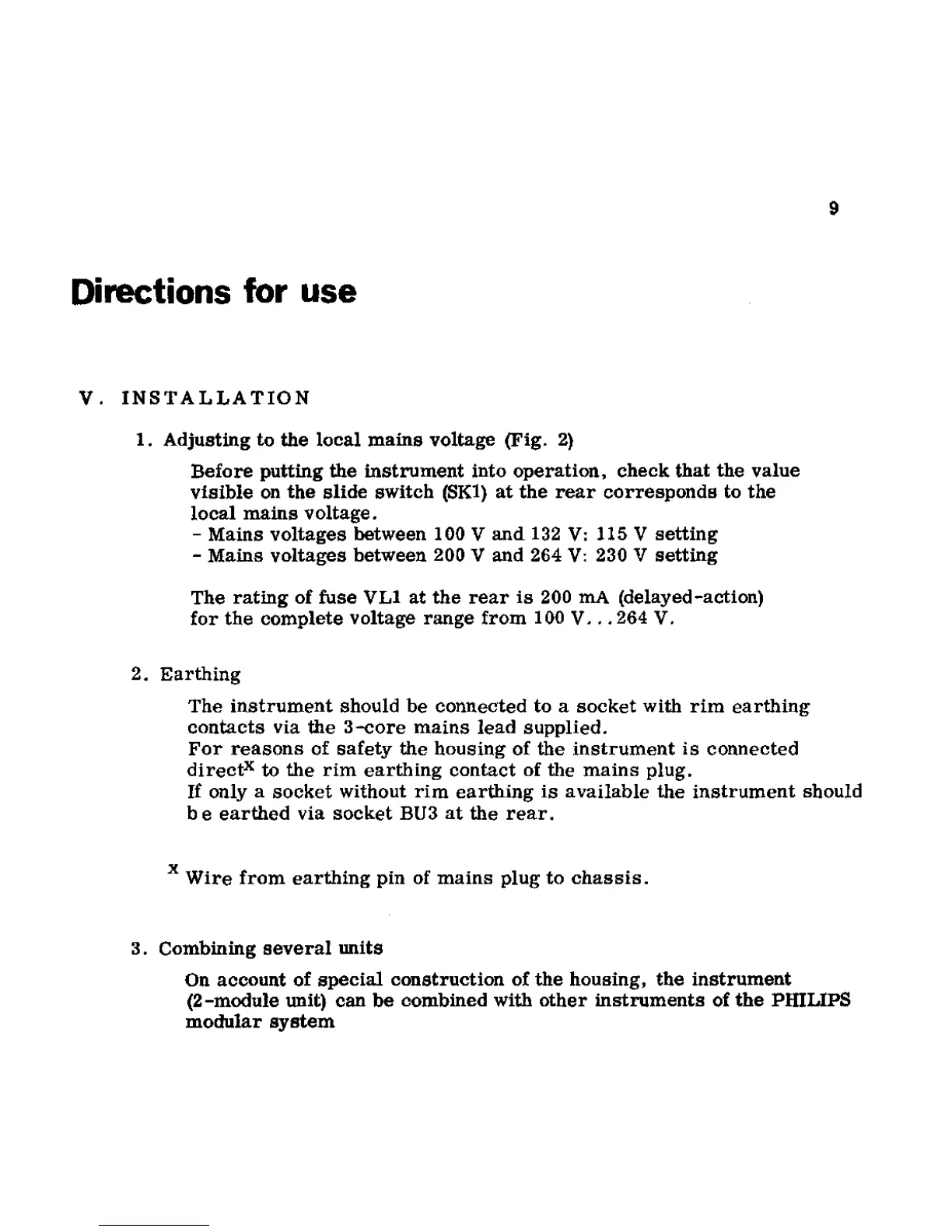Philips PM2454 - Directions for Use; Installation; Adjusting to the Local Mains Voltage; Earthing