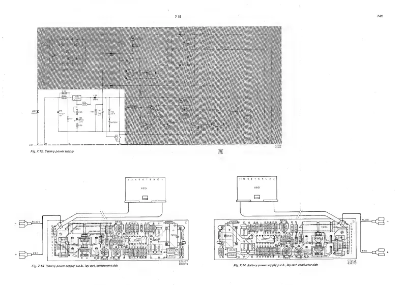 Philips PM2519 - Fig. 7.12. Battery power supply; Fig. 7.13. Battery power supply p.c.b., lay-out, component side; Fig. 7.14. Battery power supply p.c.b., lay-out, conductor side