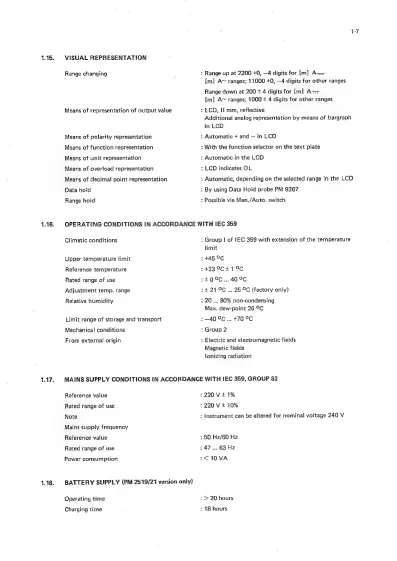 Philips PM2519 - 1.15. VISUAL REPRESENTATION; 1.16. OPERATING CONDITIONS IN ACCORDANCE WITH IEC 359; 1.17. MAINS SUPPLY CONDITIONS IN ACCORDANCE WITH IEC 359, GROUP S2; 1.18. BATTERY SUPPLY (PM 2519;21 version only)