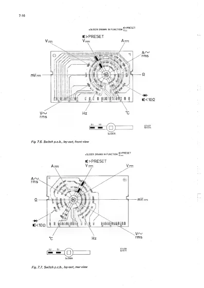 Philips PM2519 - Fig. 7.6. Switch p.c.b., lay-out, front view; Fig. 7.7. Switch p.c.b., lay-out, rear view